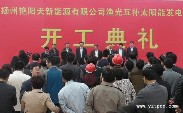 2014年4月18日,揚(yáng)州艷陽天新能源有限公司漁光互補(bǔ)太陽能發(fā)電項(xiàng)目開工奠基儀式在寶應(yīng)縣柳堡仁里蕩隆重舉行。寶應(yīng)縣相關(guān)領(lǐng)導(dǎo)、上海新能源行業(yè)協(xié)會(huì)會(huì)長(zhǎng)朱元昊、揚(yáng)州艷陽天新能源有限公司負(fù)責(zé)人、柳堡各村(居)支部書記、各部門單位負(fù)責(zé)人、柳堡鎮(zhèn)機(jī)關(guān)全體干部等參加了開工奠基儀式。