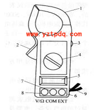 1-鉗頭2-鉗頭扳機3-保持開關(guān)4-旋轉(zhuǎn)開關(guān)5-顯示器6-絕緣測試附件接口7-公共地端8-電壓電阻輸入端9-手提帶