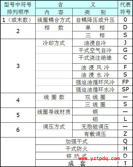 變壓器繞組數(shù)+相數(shù)+冷卻方式+是否強迫油循環(huán)+有載或無載調(diào)壓+設計序號+“-”+容量+高壓側(cè)額定電壓組成。