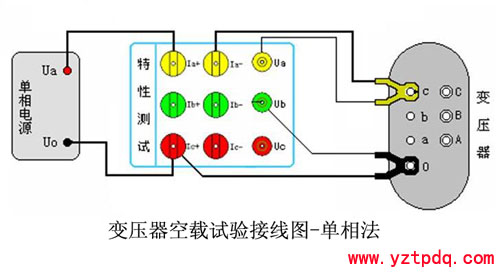 2、做A相空載時,將黃色測試鉗子夾在變壓器低壓側的a相接線柱,將紅色測試鉗子夾在變壓器低壓側的公共端;測試鉗分粗細線,按接線示意圖聯(lián)接(粗線接電流,細線接電壓)。接線無誤后,接通單相~220V交流電源,待數(shù)值穩(wěn)定后按《確定》鍵,此時完成a相測試。注意:完成a相測試后必須先斷開所加得~220V交流電源,然后換相測試(每測試完一相必須先斷開電源)
