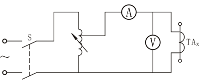 試驗接線如圖1-3所示。試驗前,應將電流互感器二次繞組引線和接地線均拆除,試驗時,一次測開路,從二次側(cè)施加電壓,為了讀數(shù)方便,可預先選取幾個電流點,逐點讀取相應電壓值。通入的電流或電壓以不超過制造廠技術(shù)條件的規(guī)定為準。當電流增大而電壓變化不大時,說明鐵芯已飽和,應停止試驗。試驗后,根據(jù)試驗數(shù)據(jù)繪出伏安特性曲線。