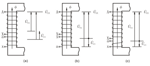 電力變壓器或互感器均存在多個(gè)繞組,多個(gè)引出端子,為了說明繞在同一鐵芯上的兩個(gè)繞組的感應(yīng)電動(dòng)勢的相對關(guān)系采用了“極性”這一概念。同一鐵芯上的電力變壓器繞組有同一磁通流過,兩繞組若以同側(cè)線端為起始端,電力變壓器繞組向相同,則感應(yīng)電動(dòng)都方向相同;繞向相反,則感應(yīng)電動(dòng)勢方向相反。所以電力變壓器繞組的繞向和端子標(biāo)號(hào)一經(jīng)確定,就可以用“加極性”和“減極性”來表示兩個(gè)繞組之間的感應(yīng)電動(dòng)勢的關(guān)系。在圖1-1(a)中,兩繞組繞向相同,在同一磁通穿過時(shí),兩繞組內(nèi)的感應(yīng)電動(dòng)勢在同名端子間任何瞬間都有相同極性,此時(shí)一、二次電壓?ax和?ax相位相同,如連接X和x,?Aa等于兩電壓差,則該電力變壓器的兩繞組就為“減極性”關(guān)系。如將二次繞組標(biāo)號(hào)交換[見圖1-1(b)所示],顯然同名端子間的電動(dòng)勢將變成相反方向,電壓相位差為180°,這時(shí)連接Xx后,?Aa是?ax與?ax之和。則電力變壓器此兩繞組之間是“加極性”關(guān)系。同理,在圖1-1(c)中,保持圖1-1(a)中的繞組標(biāo)號(hào)。而將ax繞組繞向改變,則電力變壓器 兩繞組又成了”加極性“關(guān)系。