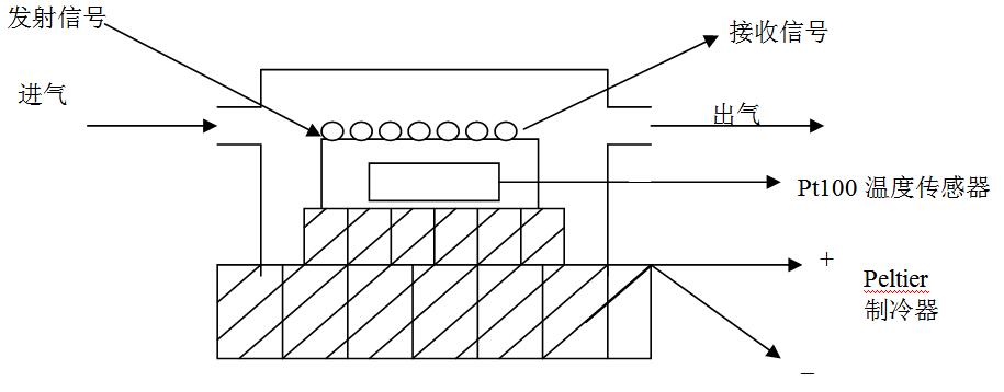 如圖1所示,氣體通過露點測量室時掠過露層傳感器。當露層傳感器溫度高于該氣體的露點溫度時,露層傳感器呈干燥狀態(tài),此時,通過露層傳感器的發(fā)射信號和接收信號,經(jīng)控制回路比較、放大,驅(qū)動熱電制冷器(由一級或數(shù)級Peltier元件組成),對露層傳感器制冷;當露層傳感器溫度降至樣氣的露點溫度以下時,露層傳感器上開始結(jié)露(或霜),這時接收器采集的信號產(chǎn)生變化,此變化經(jīng)控制回路比較、放大后調(diào)節(jié)熱電制冷器激勵,使其制冷功率減小,zui后,露層傳感器溫度保持在樣氣的露點溫度上。