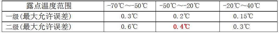 精密露點儀的示值誤差為儀器測量的平均值Td 與計量檢定值Td’之差,精密露點儀在露點溫度-70℃~+40℃之間的zui大允許誤差應符合表1中的技術(shù)要求。