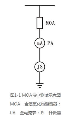 金屬氧化物避雷器目前廣泛采用一體化結構即制造廠家在計數器前邊串一只全電流mA表,在運行電壓下測量全電流值,根據此電流值大小,判斷MOA的運行狀態(tài)。接線圖如圖1-1所示。