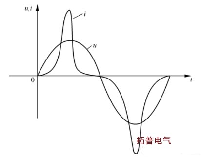 空載時(shí),電流很小,鐵芯處于非線性區(qū),電流發(fā)生畸變,其波形比普通的正弦波要“尖”,通常稱為“尖頂波”。電流增大后,這種現(xiàn)象會(huì)隨之消失,當(dāng)電流過大時(shí),會(huì)進(jìn)入另一端非線性區(qū)域,電流又會(huì)發(fā)生畸變。
