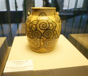 2008年北京奧運會期間,來自揚州的5件展品分別參加了“中國記憶——5000年文明瑰寶展”和“奇跡天工——中國古代發(fā)明創(chuàng)造展”,其中就有這件黃釉褐綠彩云紋罐(長沙窯)。這件寶貝目前就藏于揚州雙博館,是典型的唐代器物。