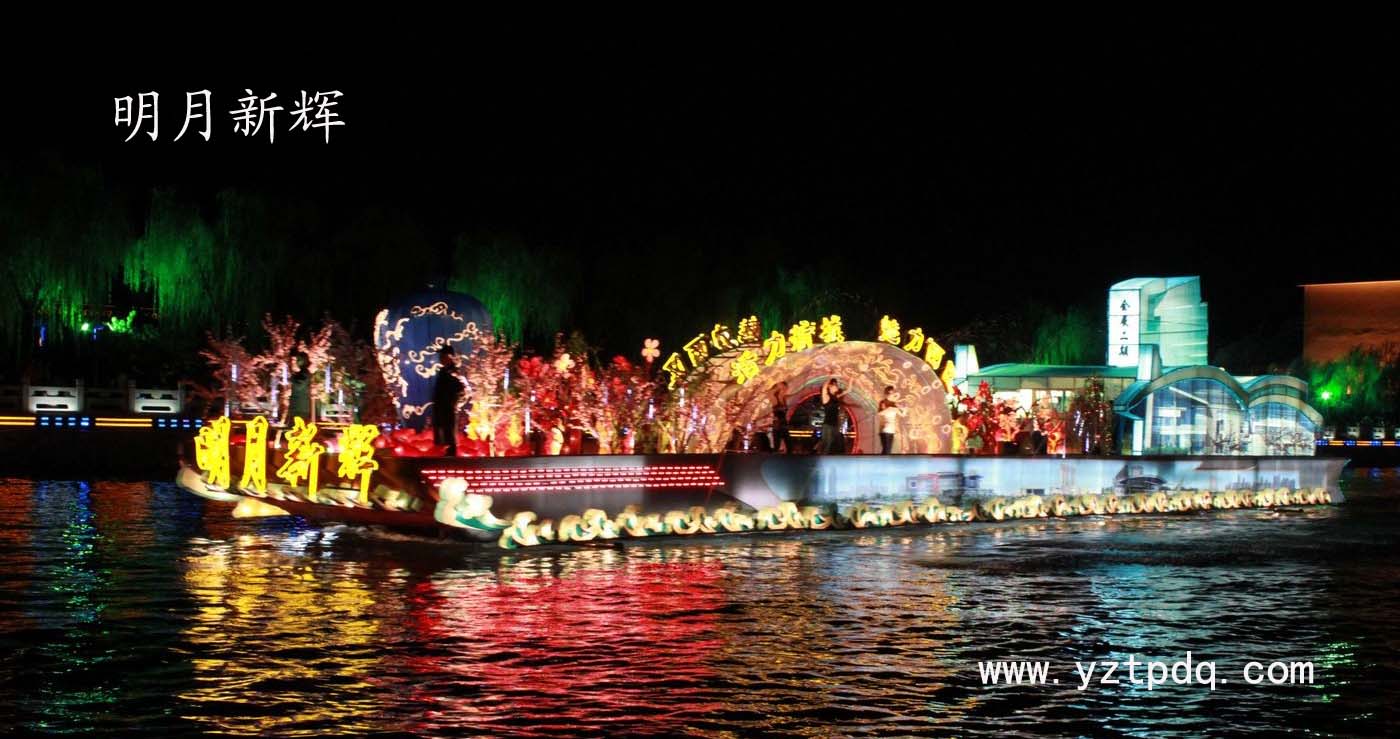 新城西區(qū)承制的“明月新輝”號花船,首先映入我們眼簾的是雙博館鎮(zhèn)館之寶“霽藍釉白龍梅瓶”,它是世界舉世無雙的珍稀國寶。瞧,在絢麗的燈光照耀之下,仿佛讓人們有了一種穿越揚州2500年歷史的感覺。