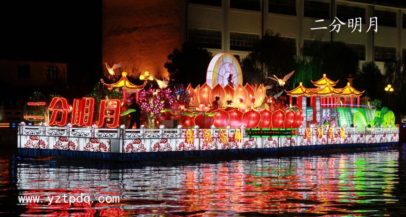 由蜀岡—瘦西湖風(fēng)景名勝區(qū)制作的領(lǐng)航花船“二分明月”號(hào)。該花船以國家5A級(jí)風(fēng)景區(qū)蜀崗—瘦西湖為藍(lán)本建構(gòu)。風(fēng)姿卓越獨(dú)樹一幟的五亭橋,寓意著幸福年年,代表著人類的智慧與巧思?;始艺洳匾撇綋Q景的白塔,見證著鹽運(yùn)的發(fā)達(dá),代表著至高的榮耀與尊寵。亭臺(tái)軒榭、層巒疊嶂、青山掩翠、桃紅柳綠,好一個(gè)荷塘月色,人間仙境。