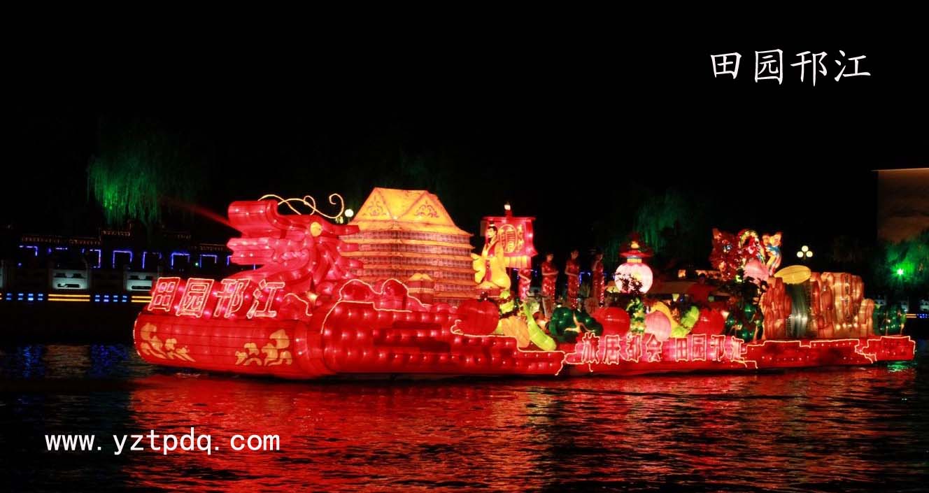 整條花船形似流水,內(nèi)透光與跑馬燈相結(jié)合,動(dòng)感十足,燈光亮麗,預(yù)示著邗江明天更加輝煌、燦爛。
