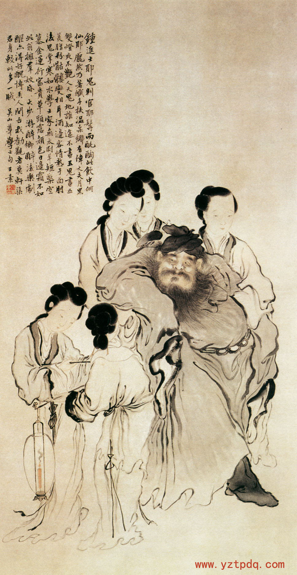 【鐘馗圖】描繪五仕女簇?fù)碇谱淼溺娯敢箽w的情景。鐘馗作張髯大腹、步履蹣跚之狀,雙目斜視,左右脅各有攙扶侍女一人,后側(cè)一侍女護(hù)送。侍女頭部發(fā)髻烏黑光亮,臉部敷脂抹粉,體態(tài)輕盈,衣褶飄逸。鐘馗寬袍束帶,以淡墨疾筆寫(xiě)衣褶,作蘭葉描。人物畫(huà)法,以工帶寫(xiě)。左上自錄吳山尊雜詩(shī)一章,詩(shī)意揭露世態(tài)炎涼,不如盡醉為樂(lè)。此畫(huà)是王素人物畫(huà)中的佳作。