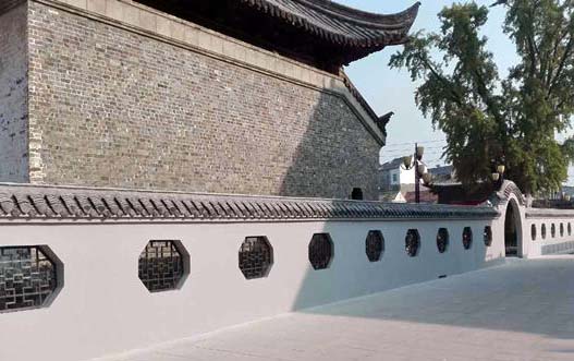 二期工程主要包括學(xué)宮圍墻的建立。因?qū)殤?yīng)學(xué)宮在寶應(yīng)城中小學(xué)內(nèi),為保證學(xué)生的人身安全,同時(shí)也出于保護(hù)古建筑的目的,寶應(yīng)學(xué)宮在大成殿和明倫堂的外圍建立了仿古圍墻。整個(gè)圍墻仿明清時(shí)代建筑風(fēng)格,建造的扇形拱門鑲上了花邊屋檐,引人入勝,更仿造古典園林造園藝術(shù),在圍墻上裝上了花格窗,以達(dá)到“移步換景”的目的。透過花格窗向里看寶應(yīng)學(xué)宮,更別有一番風(fēng)味。