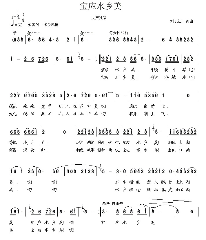 揚州的寶應縣是電影《柳堡的故事》的發(fā)源地,是原創(chuàng)歌曲作者劉長江先生的家鄉(xiāng),寶應縣也是一個美麗富饒的水鄉(xiāng)。此歌是應1992年揚州市重工業(yè)系統(tǒng)文藝調(diào)演而作,并獲創(chuàng)作三等獎。本身這首歌詞也不長,語言也上口,比較貼近生活,從創(chuàng)作構(gòu)思及動機而言還是向“大眾歌曲”方面靠,適合于群眾性演唱。作者近期做了一些修改、編曲、后期處理,與朋友共享。感謝天津音樂家石瑞生先生、歌手馮坤的支持幫助。